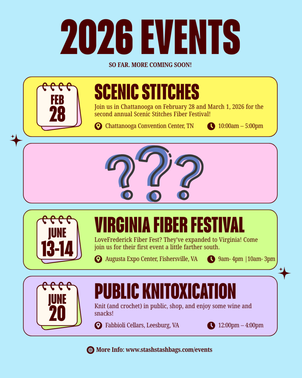 Not coming to your area? Send us a note if you have an LYS or festival you’d like us to look into attending or doing a trunk-show.